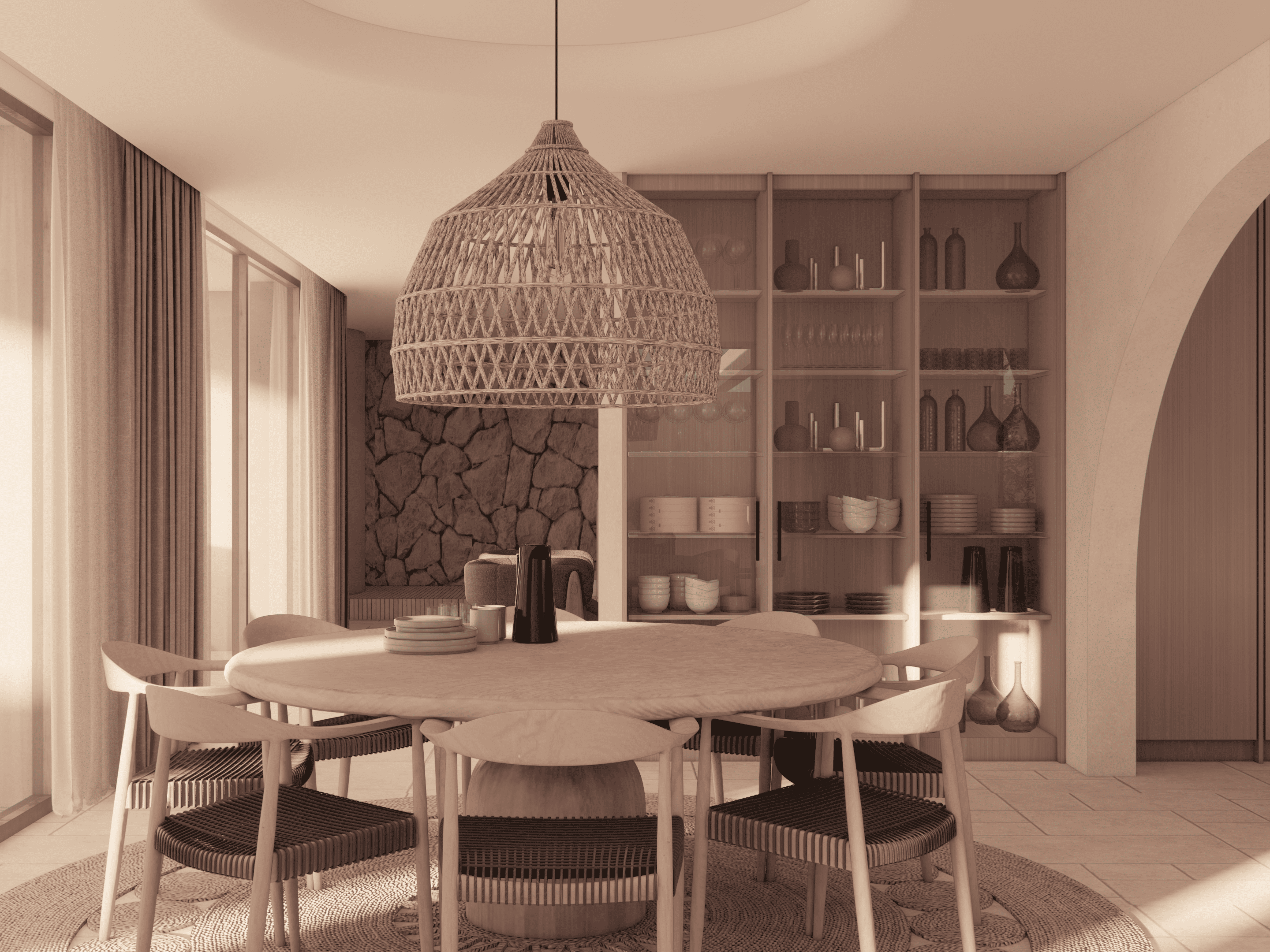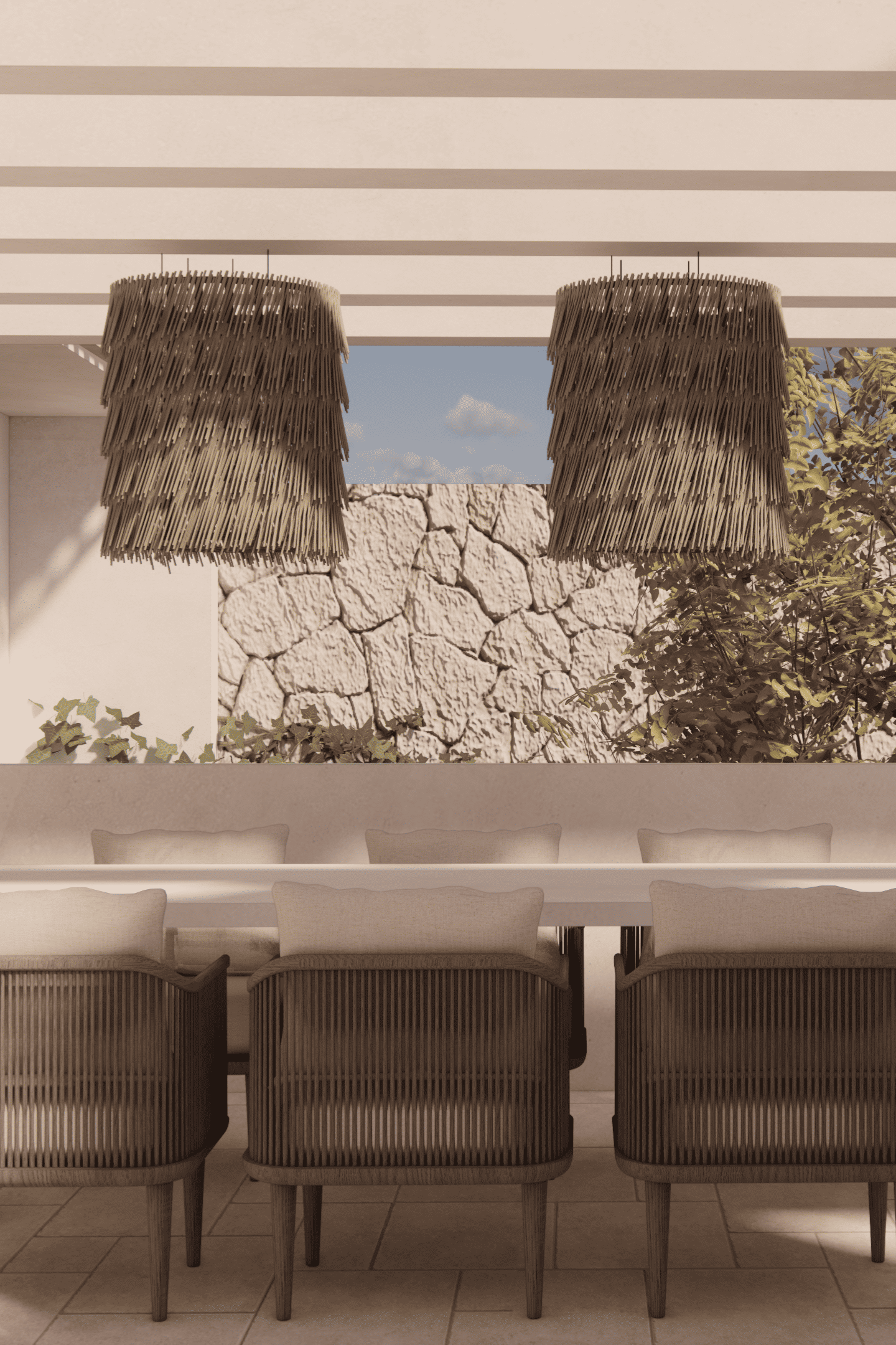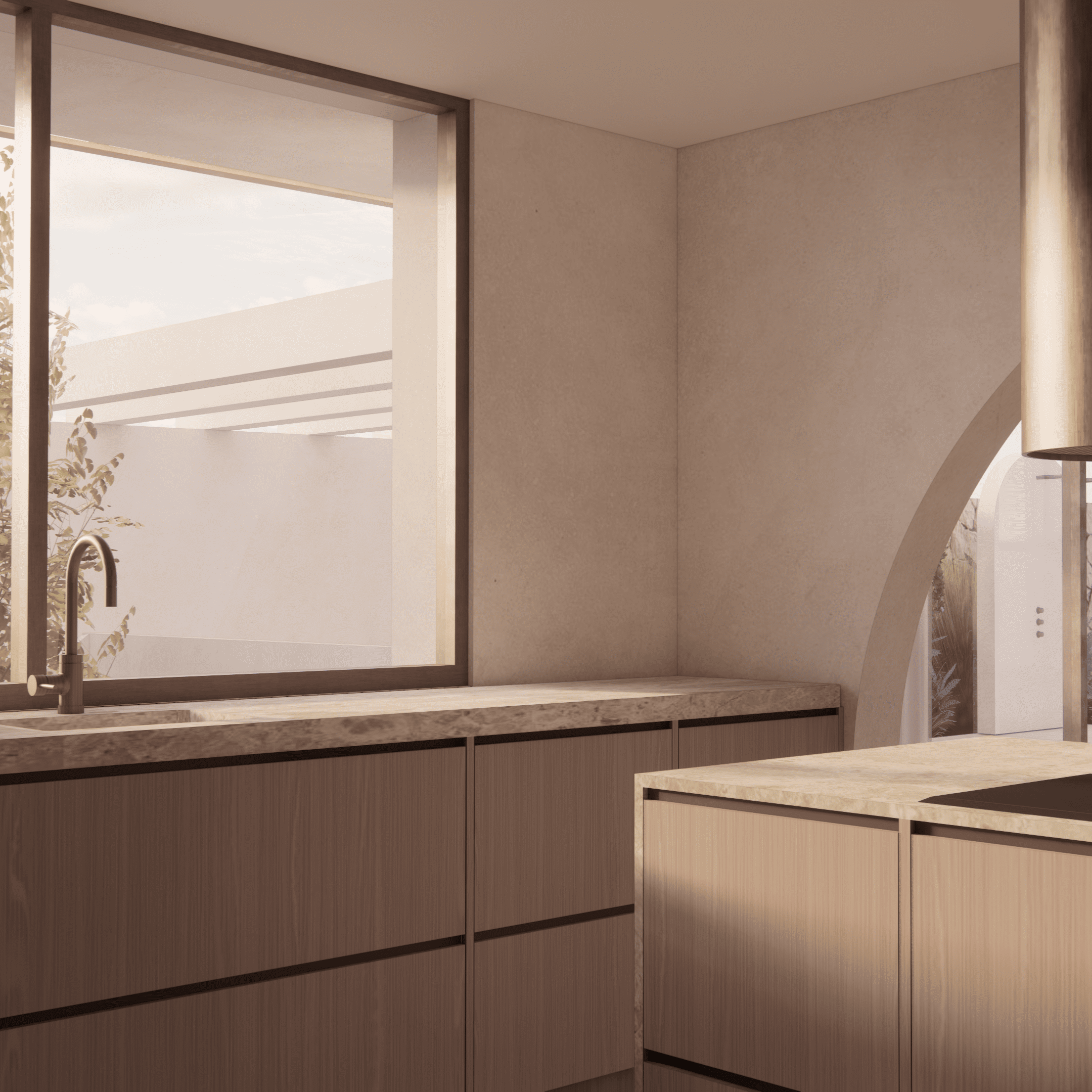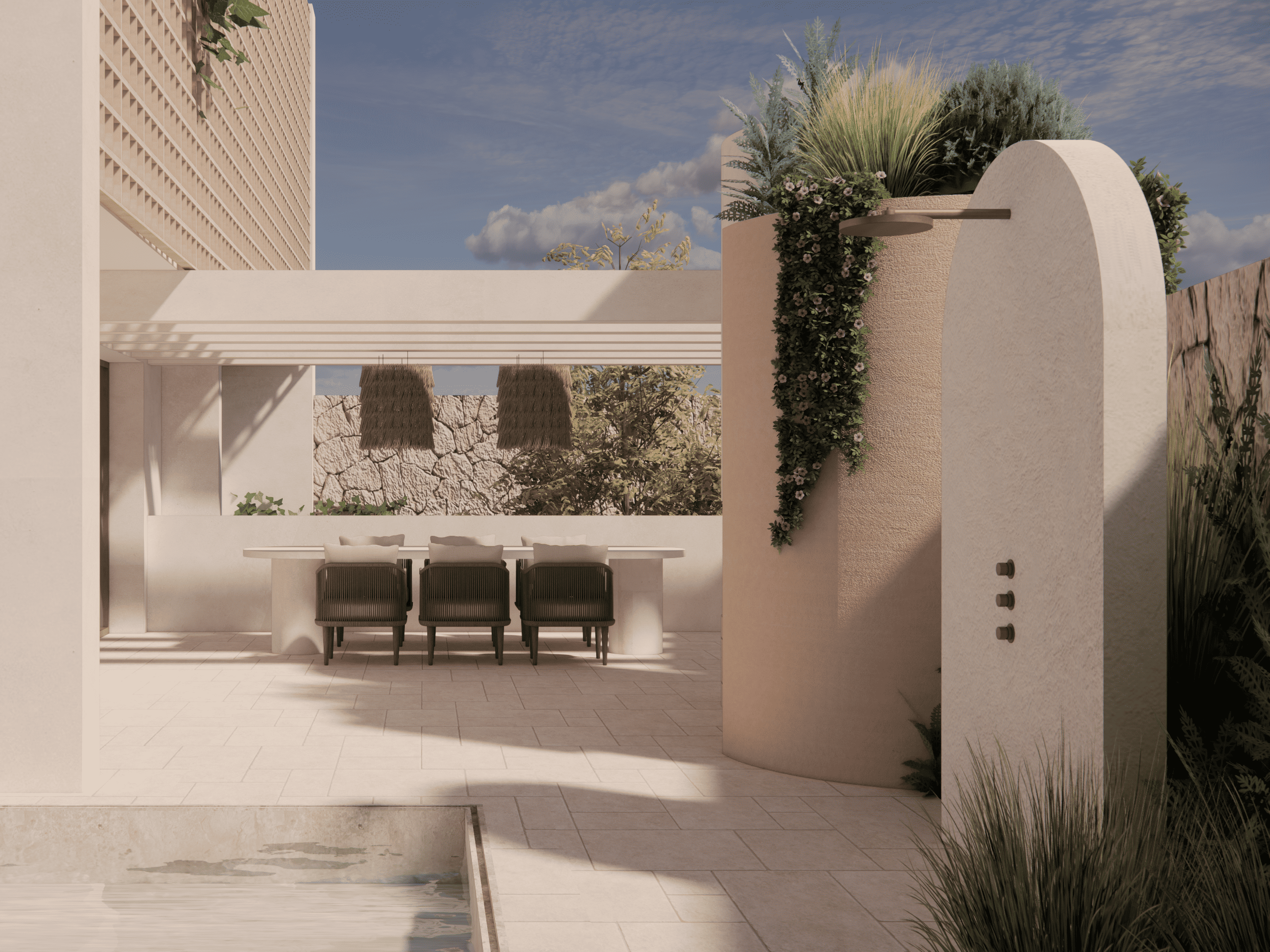 En las terrazas, no solo enmarcan las vistas y guían la luz hacia el interior, sino que también favorecen el confort climático al permitir la circulación de aire y servir de barrera parcial contra el sol. Estos elementos crean una atmósfera cálida y serena, donde la modernidad y la tradición se integran, generando un espacio armónico que refleja el espíritu mediterráneo.