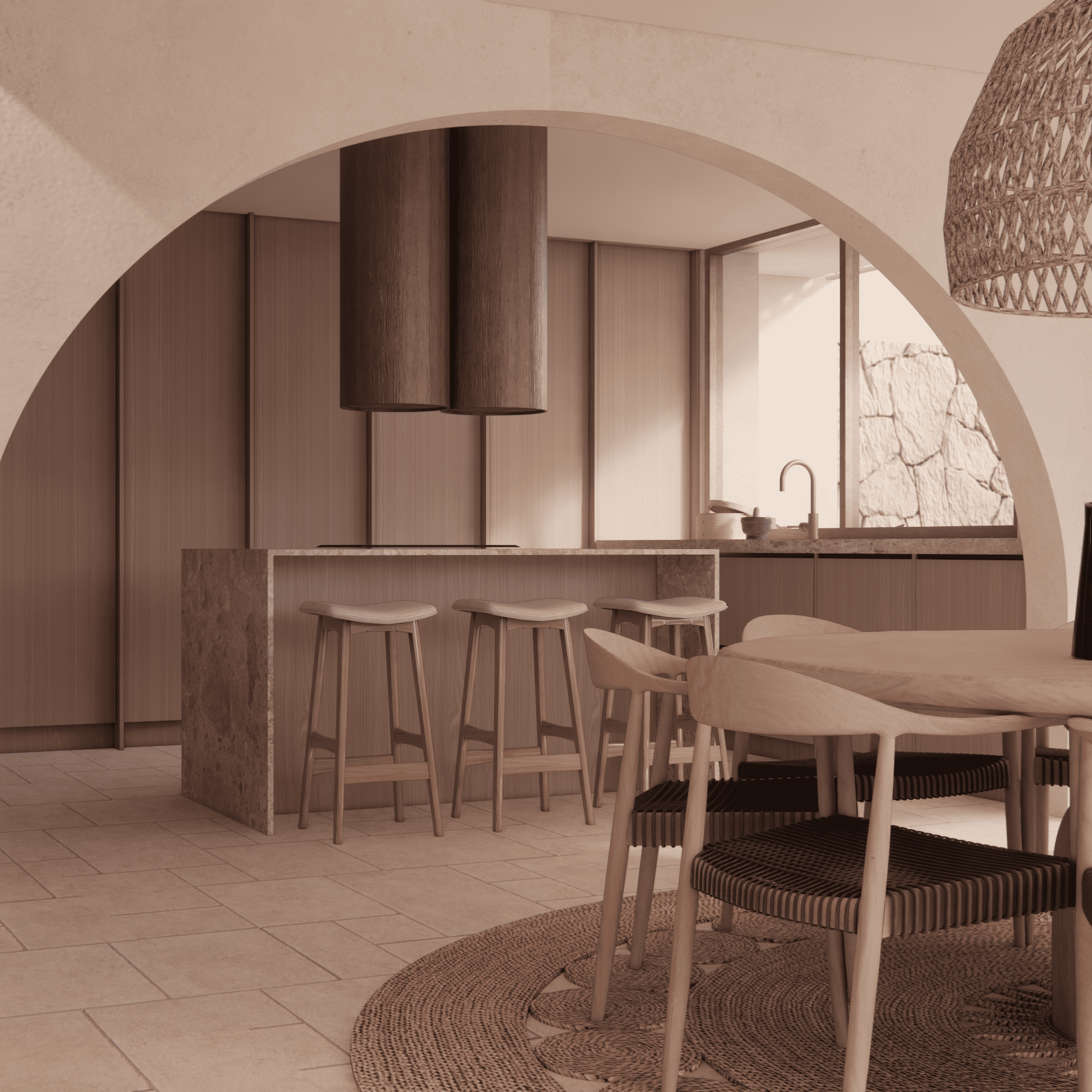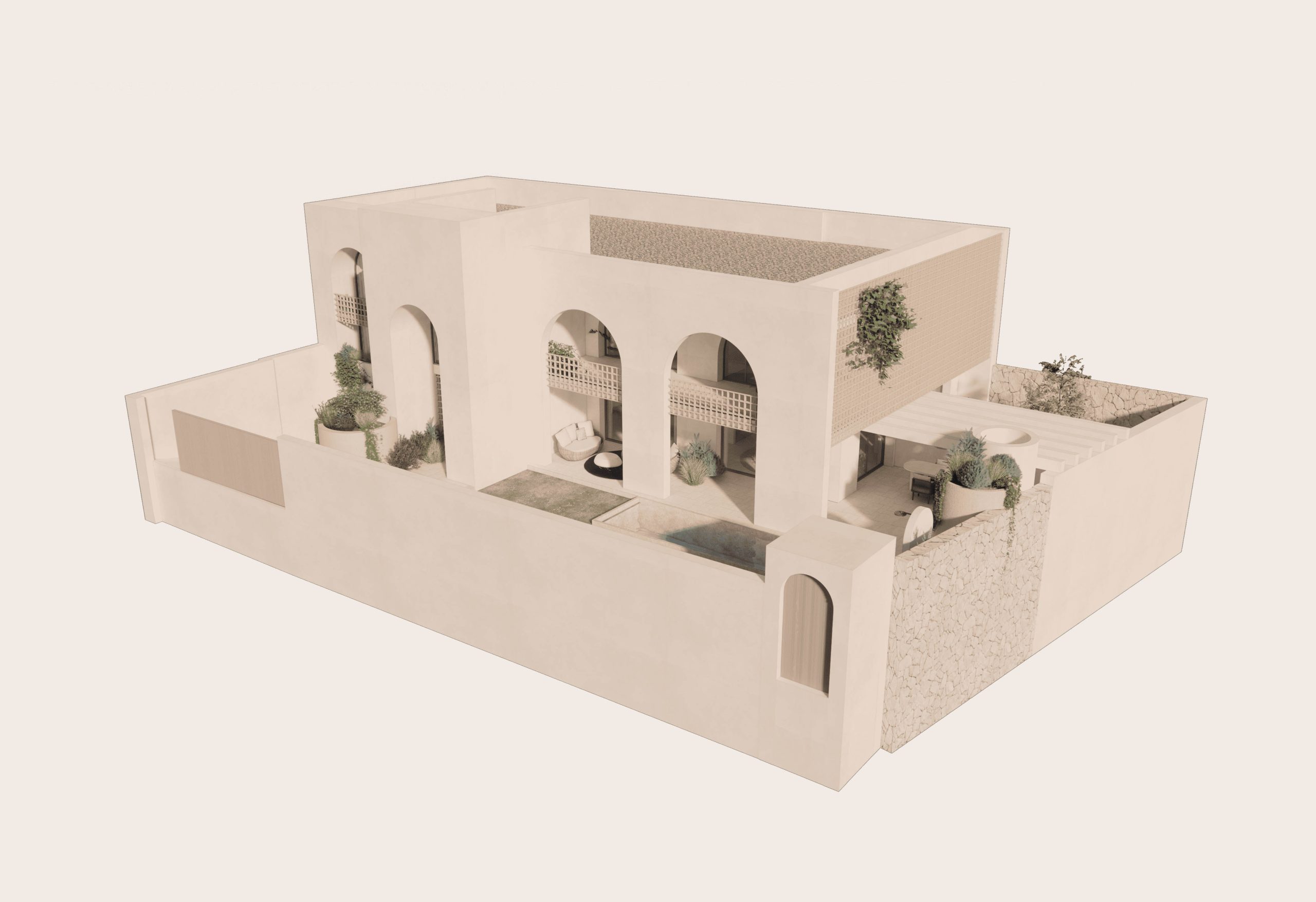 La casa fusiona elementos modernos con un marcado carácter tradicional del estilo mediterráneo, utilizando esquinas curvas y arcos de medio punto en todos los huecos de la fachada y terrazas. Estos arcos evocan la arquitectura clásica mediterránea y aportan una suavidad visual que unifica el diseño, suavizando las líneas de la estructura y creando una conexión fluida entre los espacios interiores y exteriores.