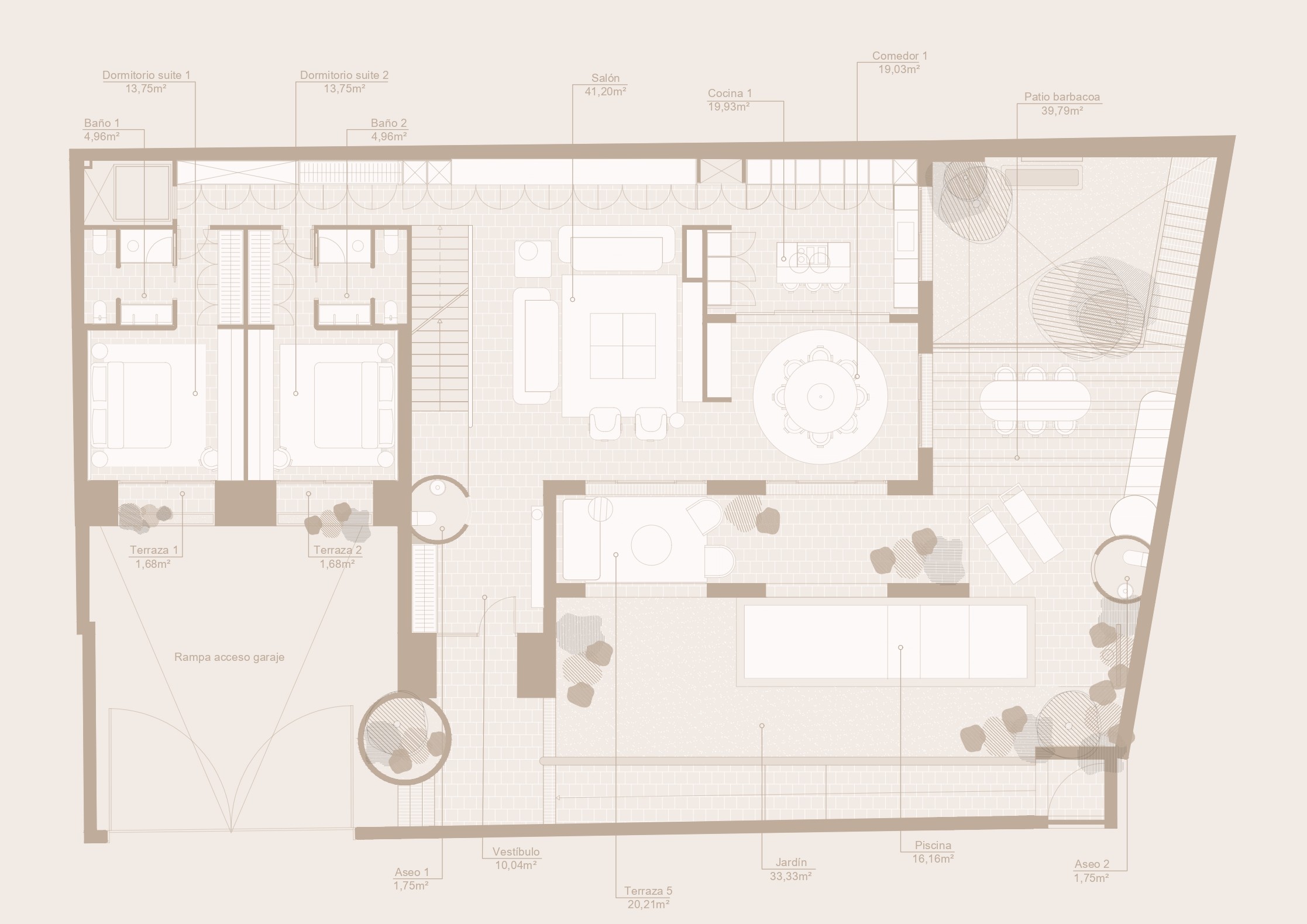 Cada rincón de la vivienda ha sido concebido para ofrecer bienestar, funcionalidad y belleza. Los interiores amplios y luminosos se abren al exterior a través de grandes ventanales, favoreciendo una continuidad espacial que diluye los límites entre dentro y fuera.Los materiales naturales, las texturas suaves y una paleta cromática serena refuerzan la sensación de calma y equilibrio, invitando a disfrutar de un estilo de vida pausado y en contacto con el entorno.