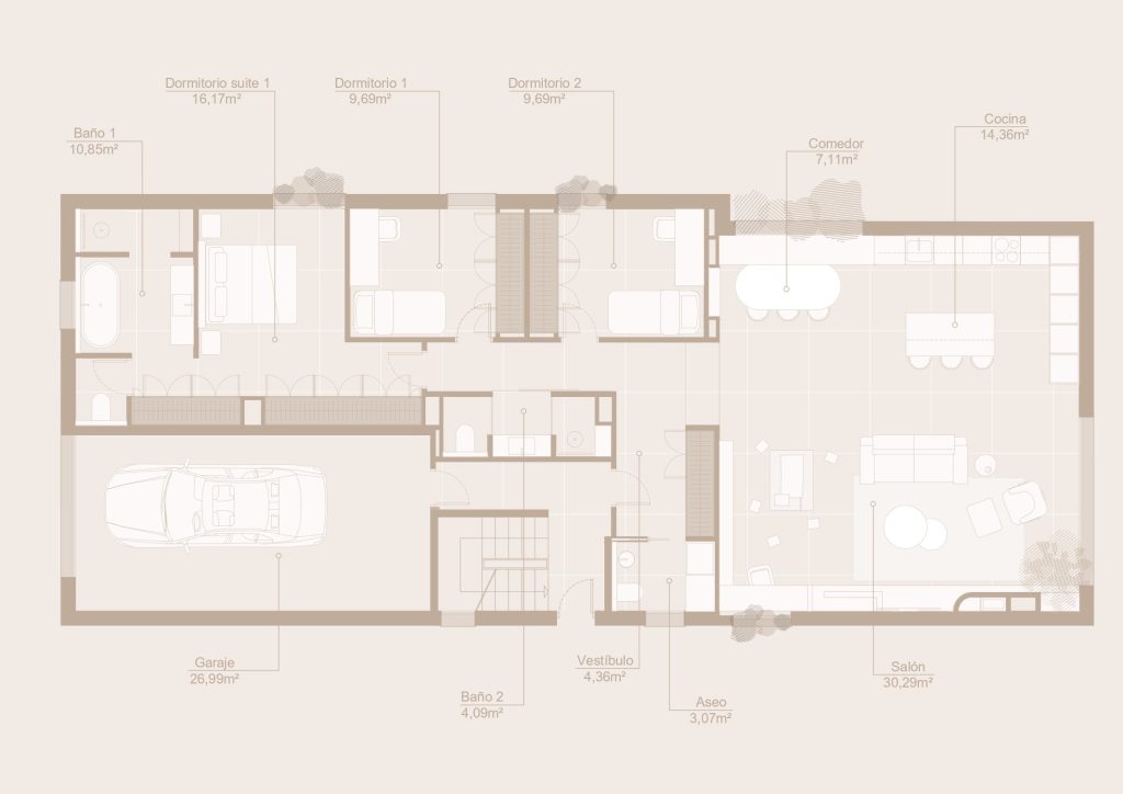 Esta casa nace del deseo de crear un espacio donde la vida fluya con calma y autenticidad. Diseñada para una familia joven, combina funcionalidad y calidez, ofreciendo el equilibrio perfecto entre intimidad y apertura. Aquí, cada rincón invita a compartir, a jugar, a descansar… a vivir.